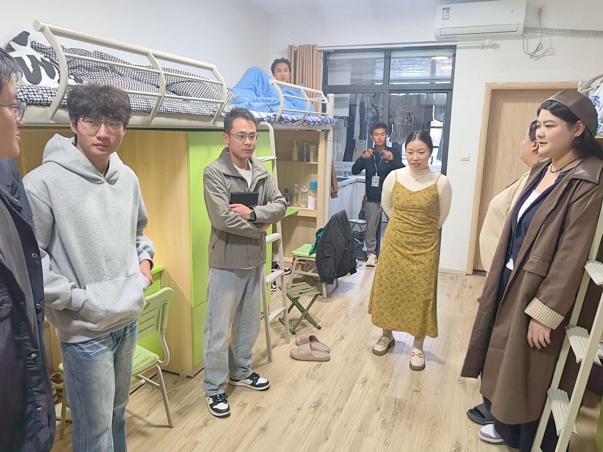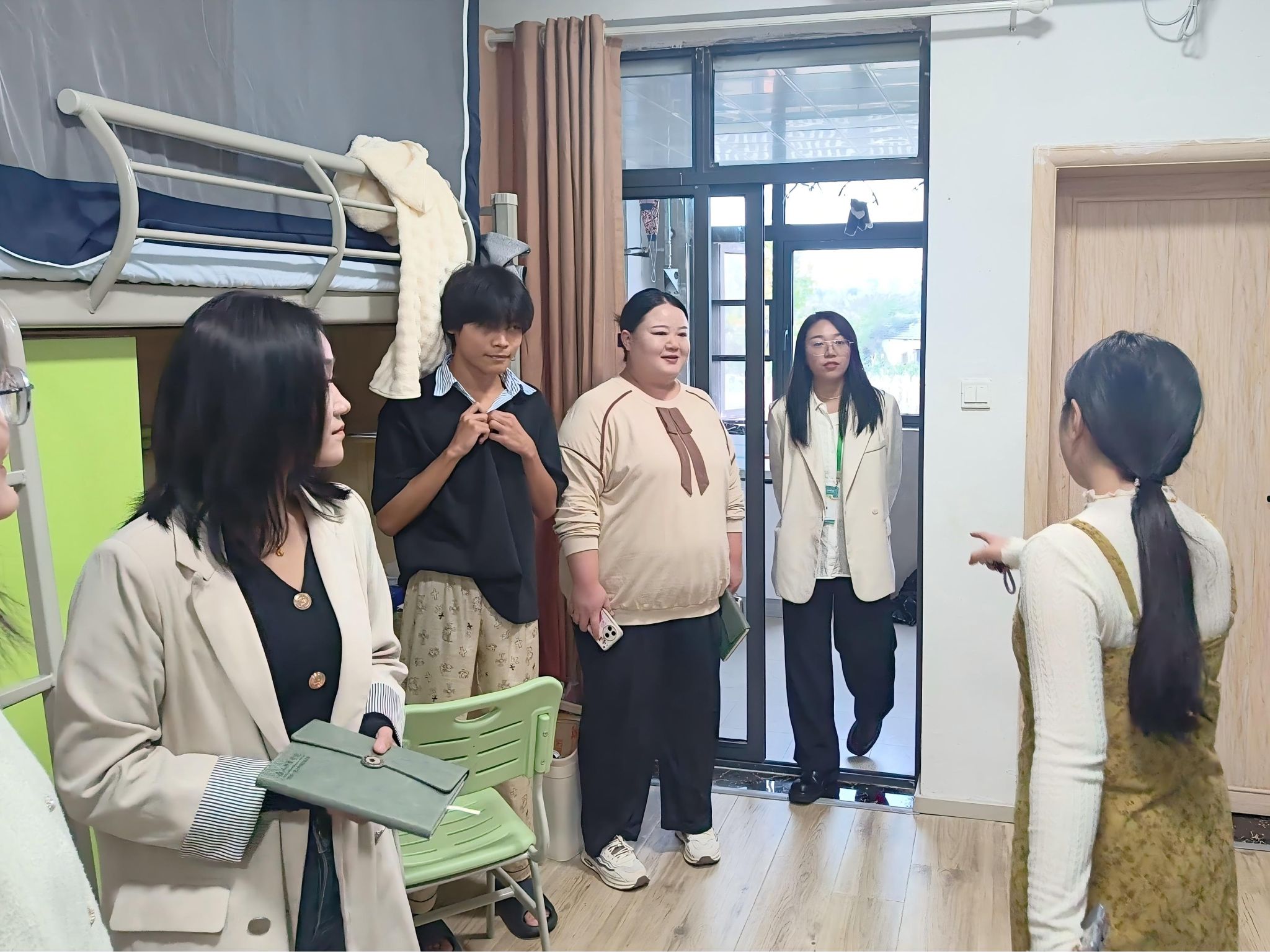 走进新生宿舍楼,辅导员们带着提前梳理的“新生关注问题清单”,敲开每一间宿舍的门。“宿舍空调效果怎么样?”“食堂哪个窗口的饭菜符合口味?”“和室友相处还习惯吗?”亲切的问候瞬间拉近了与学生的距离。在查看宿舍环境时,辅导员们不放过任何细节:从衣柜是否稳固、插座是否安全,到阳台晾晒空间是否充足,逐一检查并记录;针对部分新生反映的“宿舍门锁使用流程不熟悉”等生活问题,当场为同学们提供解决办法。