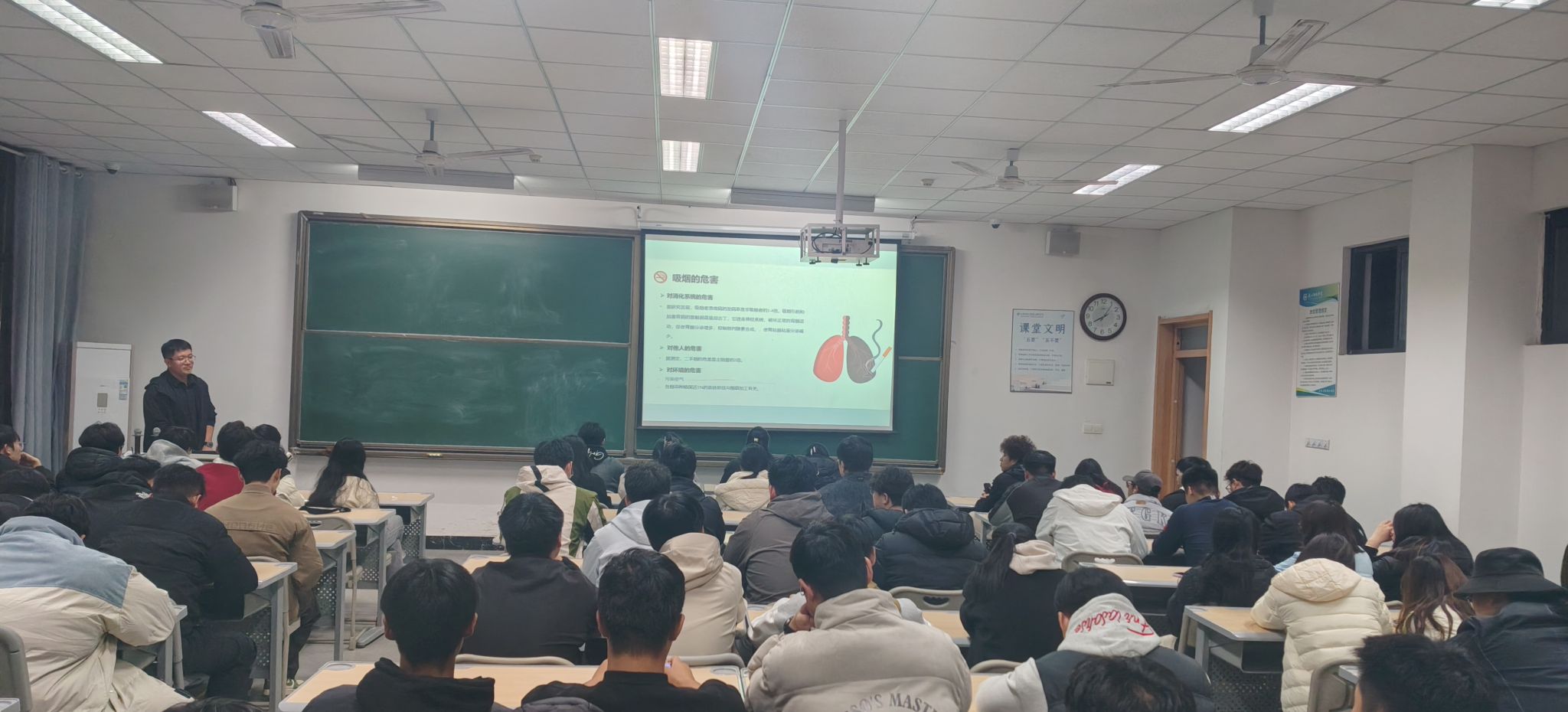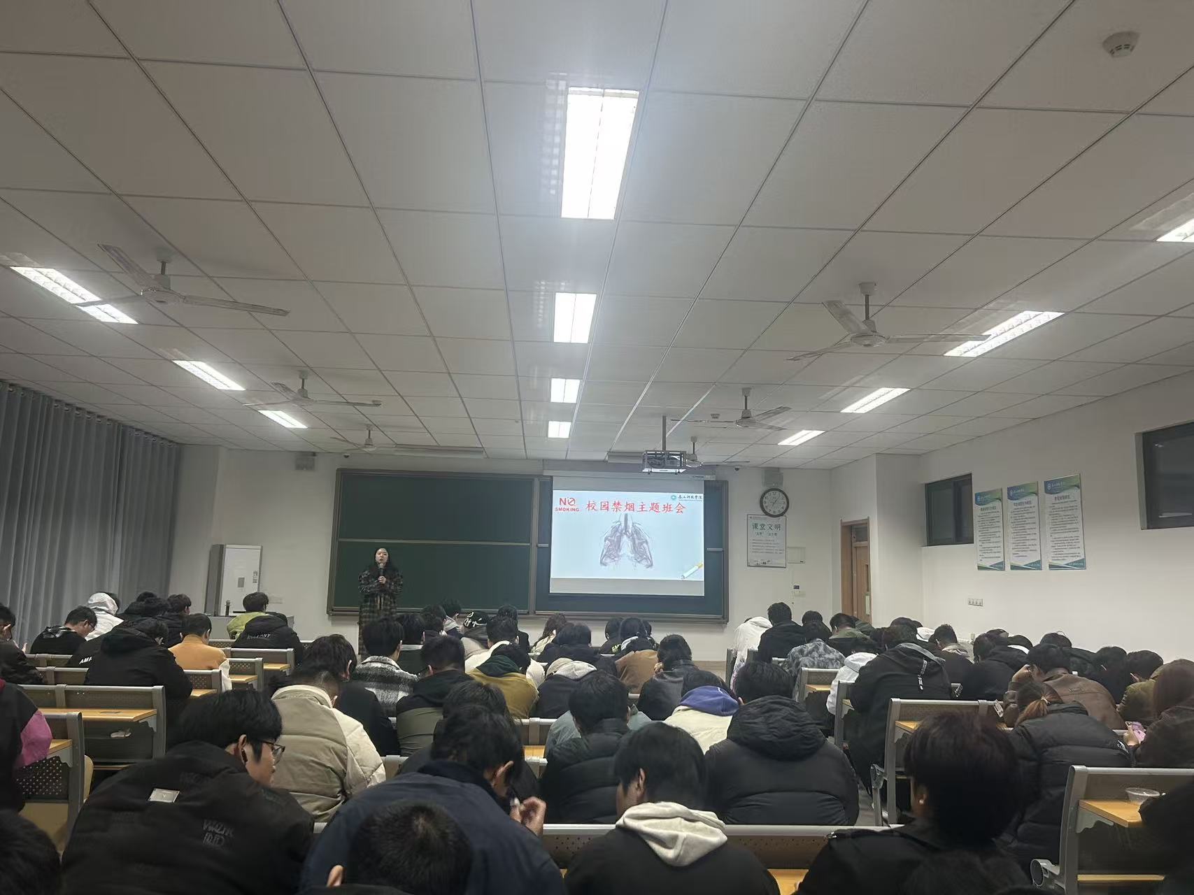 为进一步推进文明校园、平安校园建设,保障全体同学的身心健康,营造清新、和谐、向上的学习和生活环境,辅导员刘安娜老师于周日晚上7:00,在J1-501教室召开“无烟校园,健康生活”主题班会。通过科学数据和真实案例,详细阐述烟草(包括电子烟)对个人健康、校园公共环境及校园消防安全构成的严重威胁,并向全体同学发出“拒绝烟草,从我做起”的倡议,希望同学们强化自律意识,严守校园禁烟规定,不在教学楼、图书馆、宿舍、食堂、体育馆等任何校园室内外公共场所吸烟,做到不吸烟、不递烟、不劝烟,更不随意丢弃烟蒂,用实际行动守护共同的校园空间。