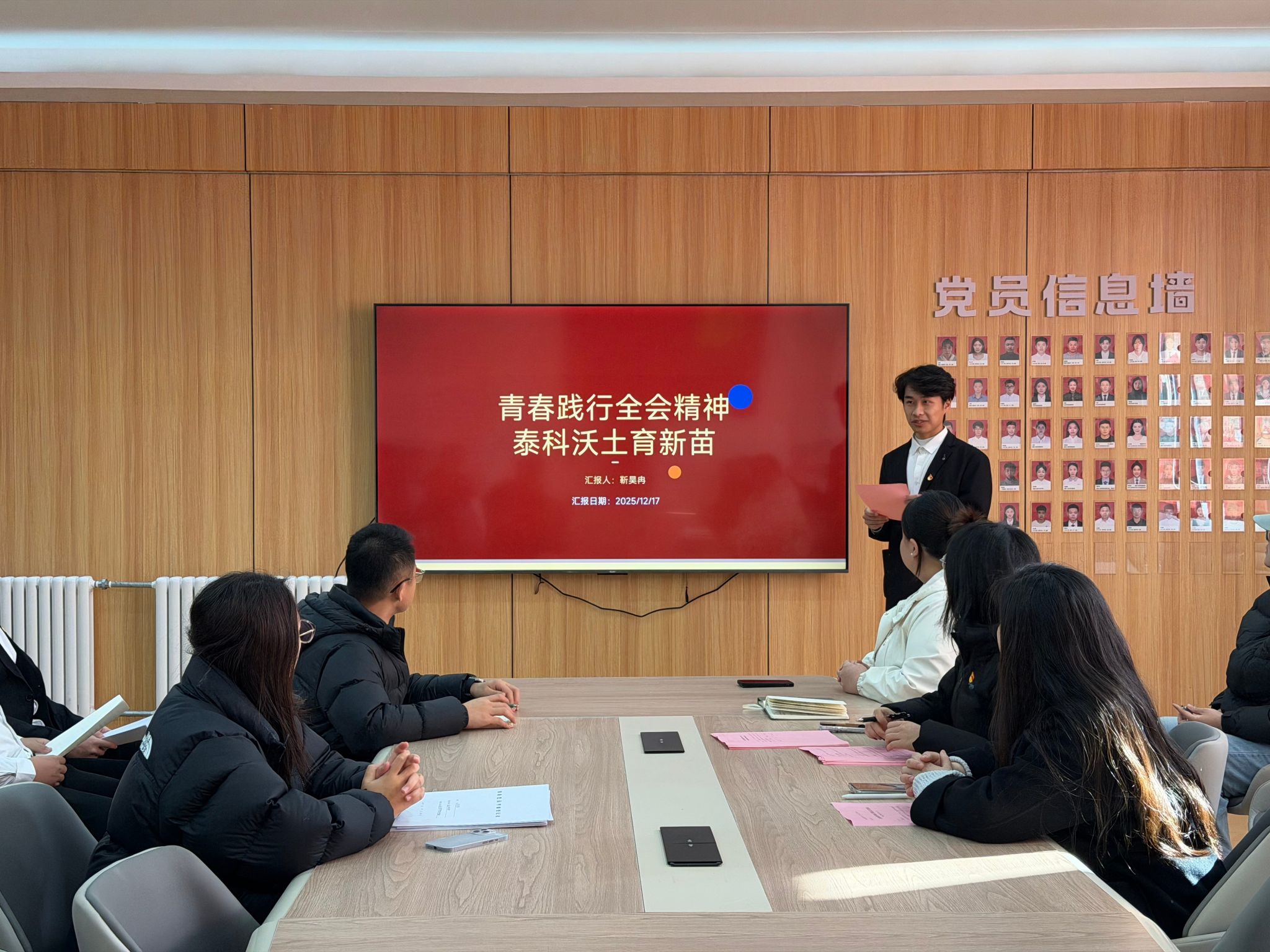 12月18日,通信工程学院学生第一党支部在敢当书院多功能党团会议室顺利召开了党的二十届四中全会精神宣讲会。泰山科技学院学习贯彻党的二十届四中全会精神青年师生宣讲团成员靳昊冉以“青春践行全会精神 泰科沃土育新苗”为主题,面向支部党员进行主题宣讲。