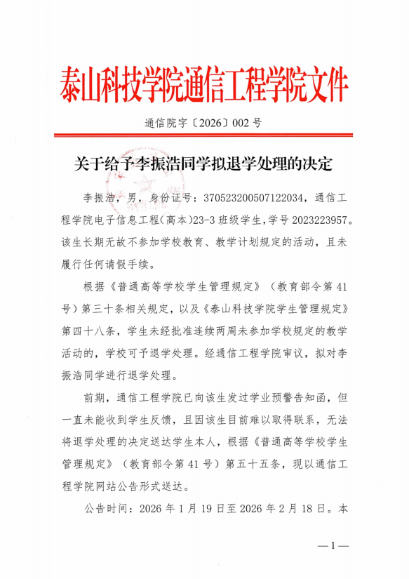 关于给予李振浩同学拟退学的决定