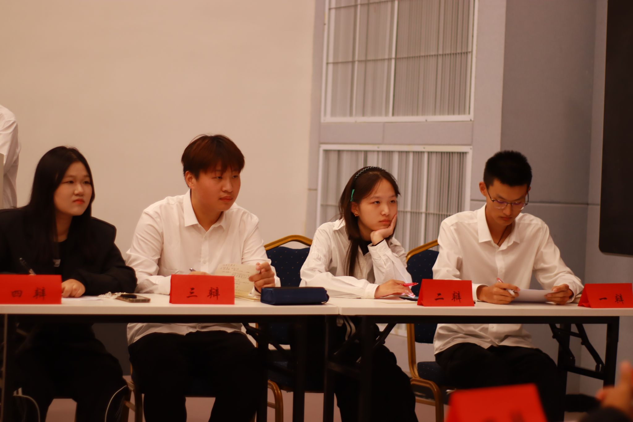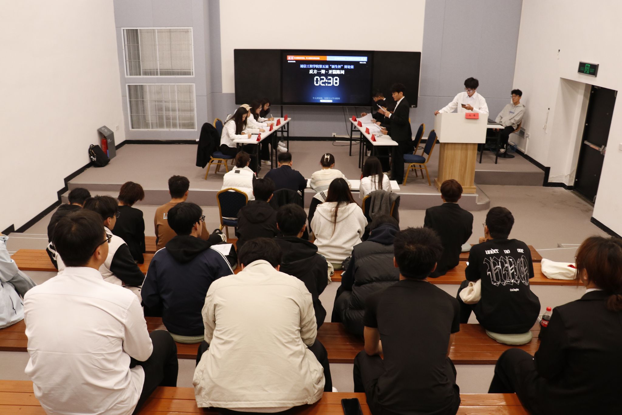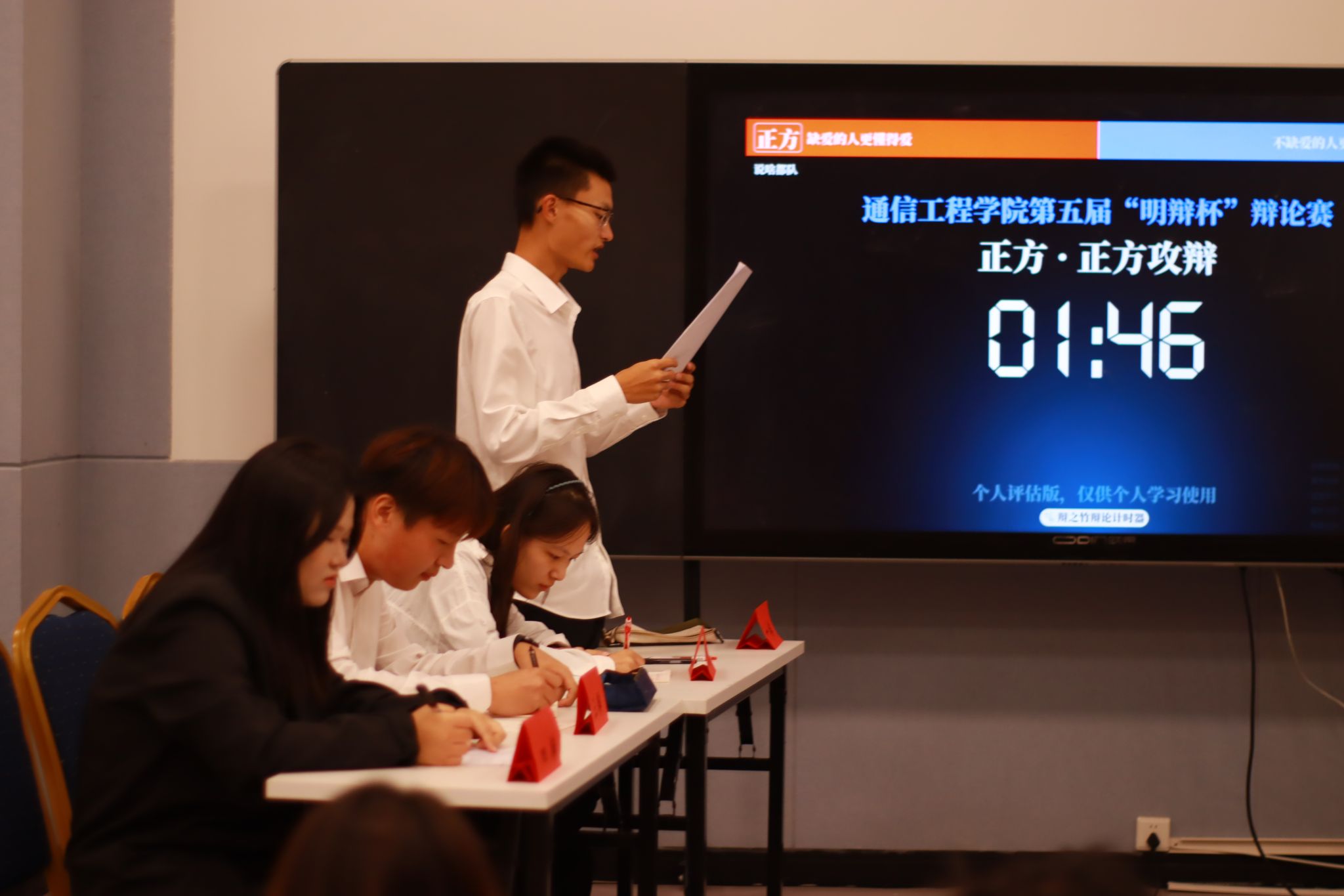 10月14日晚的模拟示范赛“干货满溢”——往届优秀辩手全程还原正式比赛流程,从一辩立框架、二辩攻漏洞,到自由辩论控节奏、四辩做总结,每个环节都细致演示。同时,工作人员结合比赛专用计时器,明确各环节时长及超时处理规则,还针对“立论如何抓核心”“自由辩论如何接话”等实用技巧进行讲解,让参赛队伍对赛事规范和辩论技巧有了直观且深入的认知。