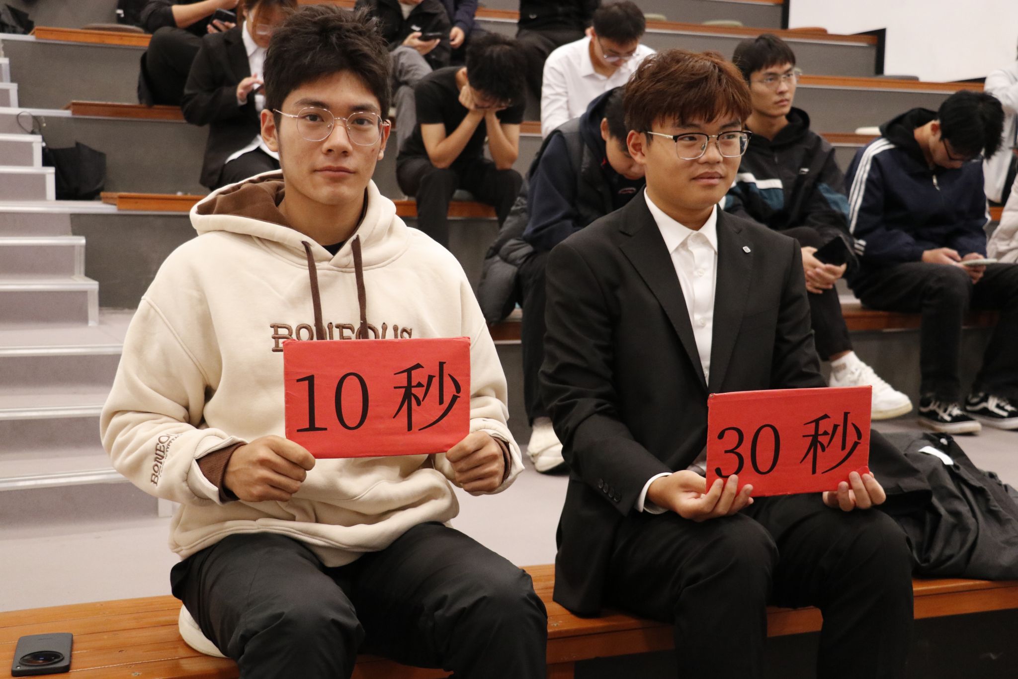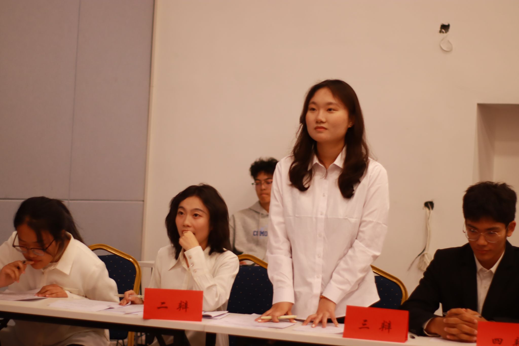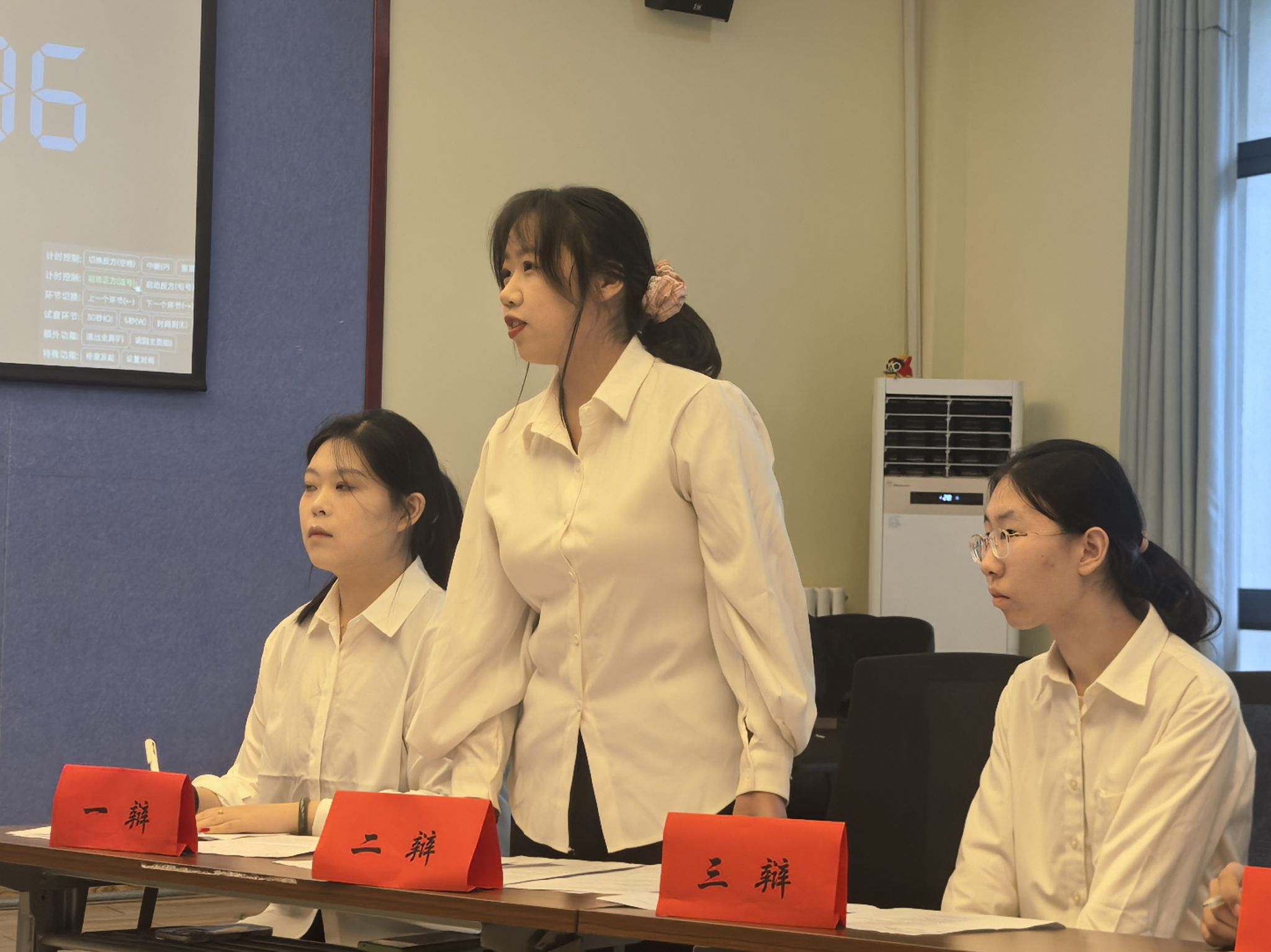 10月14日晚的模拟示范赛“干货满溢”——往届优秀辩手全程还原正式比赛流程,从一辩立框架、二辩攻漏洞,到自由辩论控节奏、四辩做总结,每个环节都细致演示。同时,工作人员结合比赛专用计时器,明确各环节时长及超时处理规则,还针对“立论如何抓核心”“自由辩论如何接话”等实用技巧进行讲解,让参赛队伍对赛事规范和辩论技巧有了直观且深入的认知。