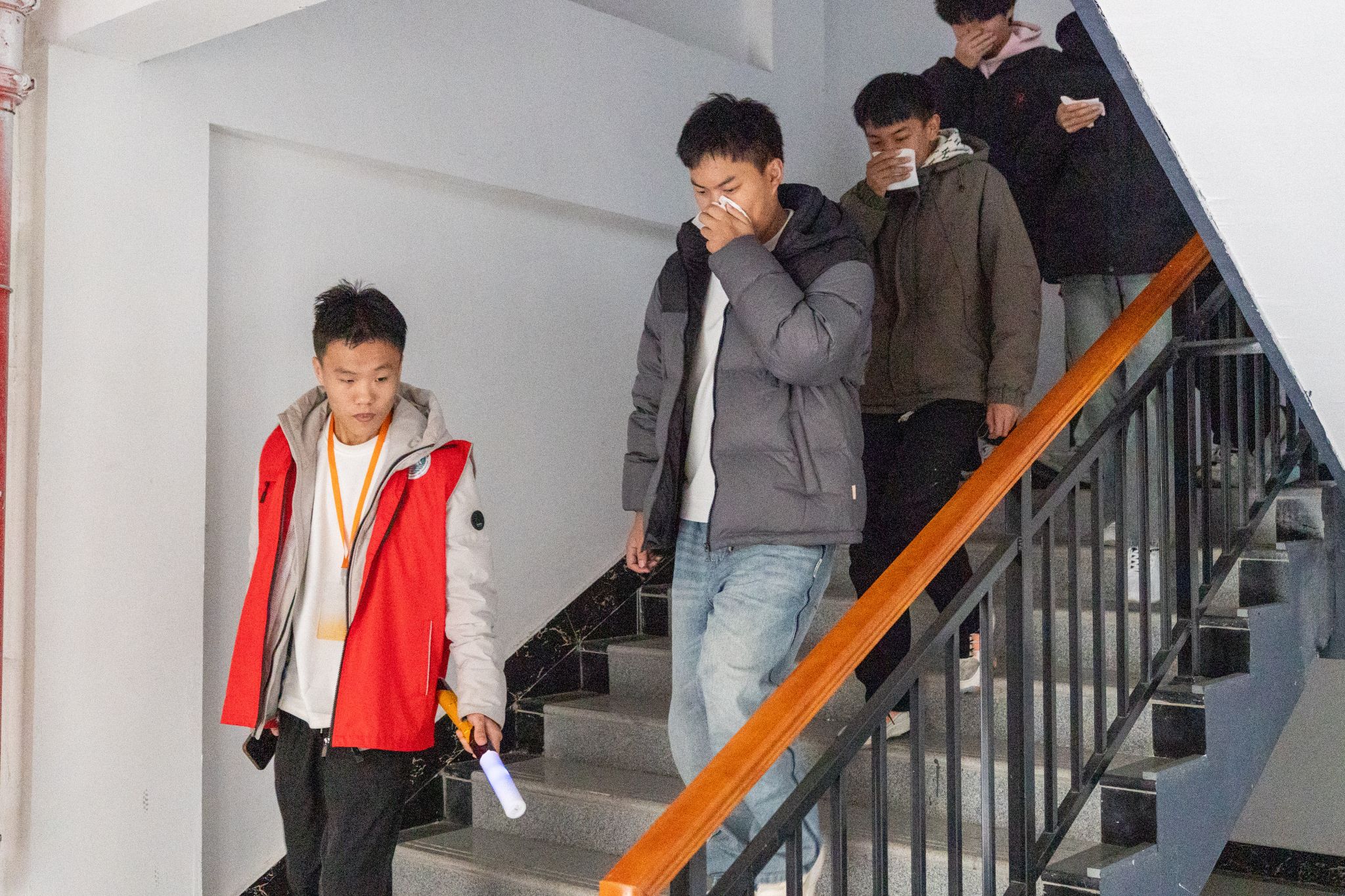 “不要拥挤!用湿毛巾捂住口鼻,弯腰低姿,沿右侧疏散指示灯快速下楼!”警铃骤响,各楼层早已就位的引导员们沉着冷静,声音洪亮,一遍遍重复着关键的逃生指令。同学们反应迅速,临“危”不乱,用提前准备的湿毛巾严捂口鼻,沿预定路线快速、有序地向楼下撤离。楼道内,脚步声密集却不杂乱,人影穿梭却秩序井然,整个过程流畅高效,正是日常安全教育成效的生动体现。