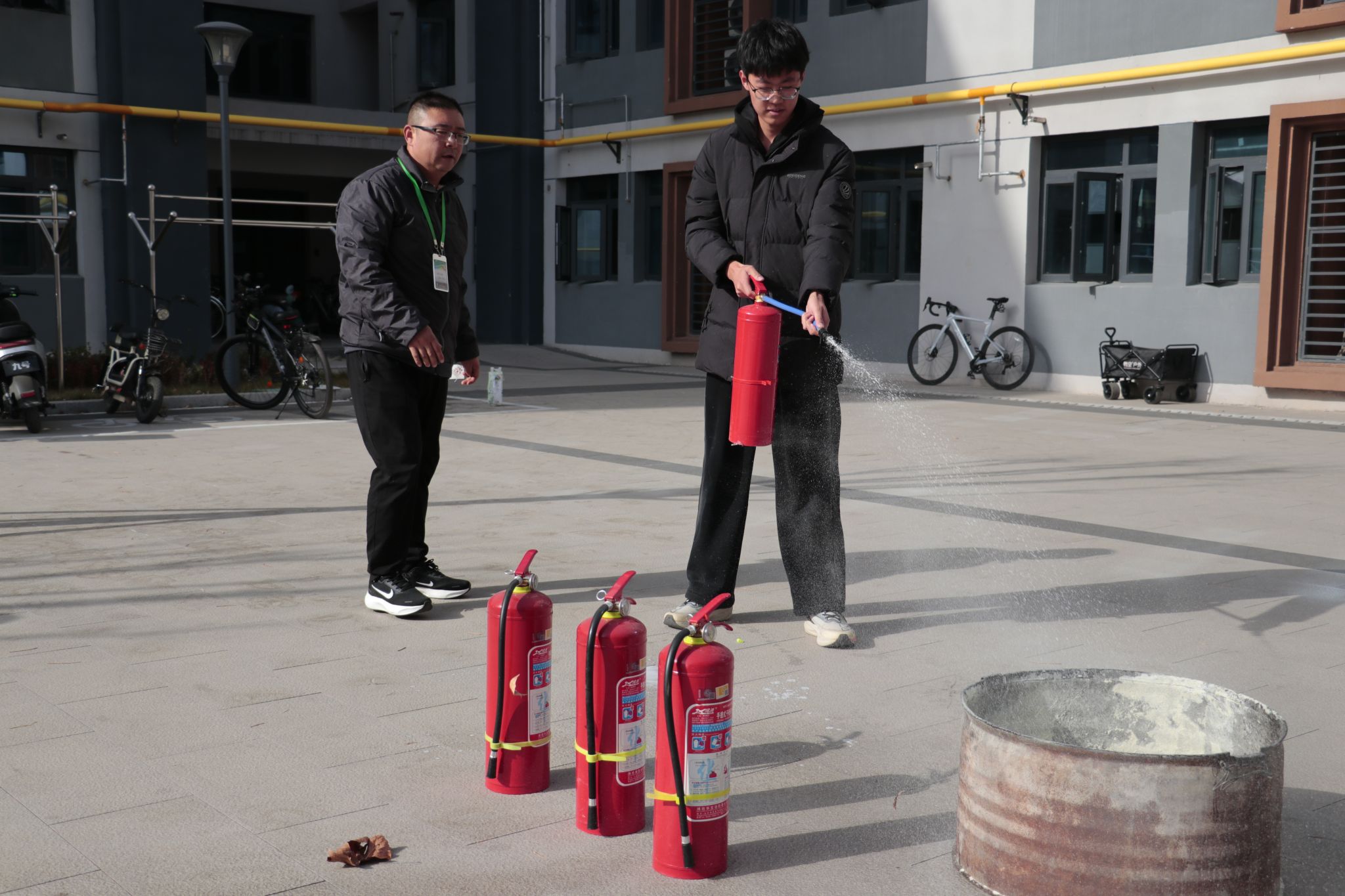 疏散完毕后,特意邀请了学校保卫处经验丰富的专业人员,在现场设置了模拟火点,并准备了多具灭火器。“提起灭火器,拔掉保险销,握住喷管前端,对准火焰根部,用力压下压把!”保卫处老师一边高声讲解,一边进行标准利落的动作示范。通过零距离与手把手教学的互动模式,极大地激发了大家的参与热情,有效将抽象的消防安全理论知识转化为了扑救初起火灾的实战能力,也获得了受益终身的消防技能。